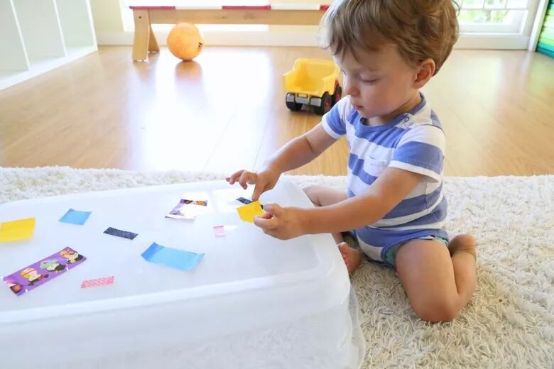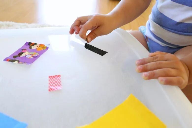 1. 将每种胶带剪下来一段,并把剪下来的胶带两端对折粘起来,让孩子更容易抓住。
