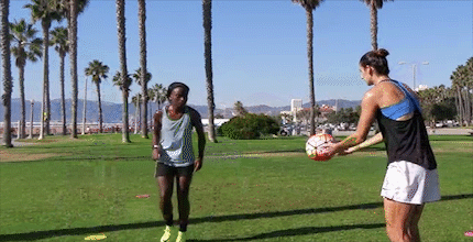 B逐渐地把距离拉大,并鼓励孩子用双手往外推球,用单手接球。