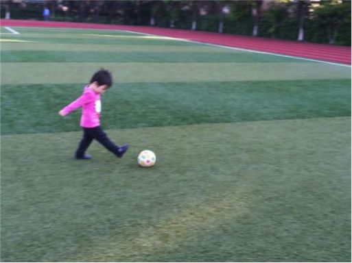 训练要求:把一直径10公分左右的软球放置在孩子跟前,让孩子踢球。