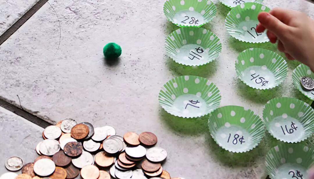 在蛋糕纸内写上金额,然后让娃坐在面前往里面扔绒球。当绒球落在哪个蛋糕纸内,就要用最少数量的纸币展示里面写的金额。