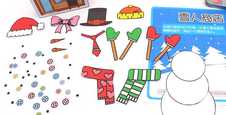给宝贝准备一个装饰游戏,比如雪人装饰,孩子要用钱币购买围巾、胡萝卜、纽扣、雪花等配件,做出一个漂亮的雪人。买这些东西时,自然就会练习到加减法。