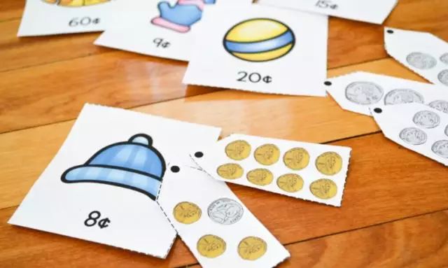用卡片制作商品并表上相应的价格,娃需要在金钱组里面找到相应的钱币数额。