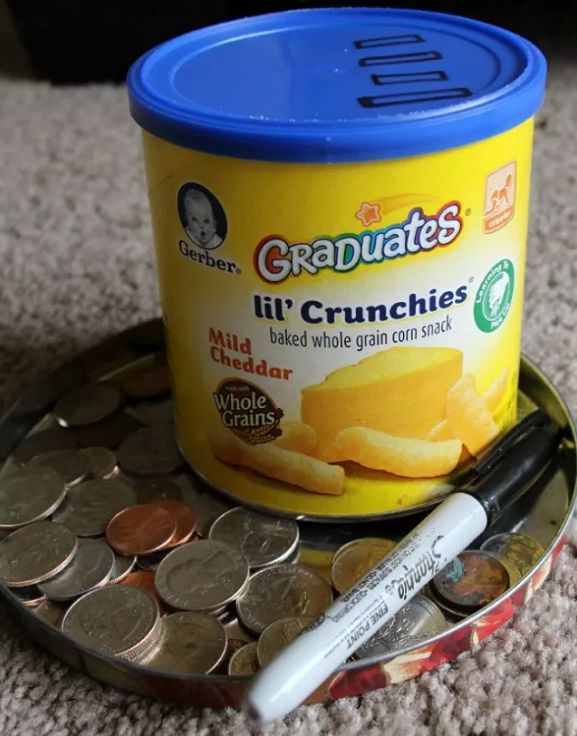 在奶粉罐的盖子上划出几个洞,在洞的旁边写上「 X 元」,娃从碗里拿出钱,从相应的洞口里放入~