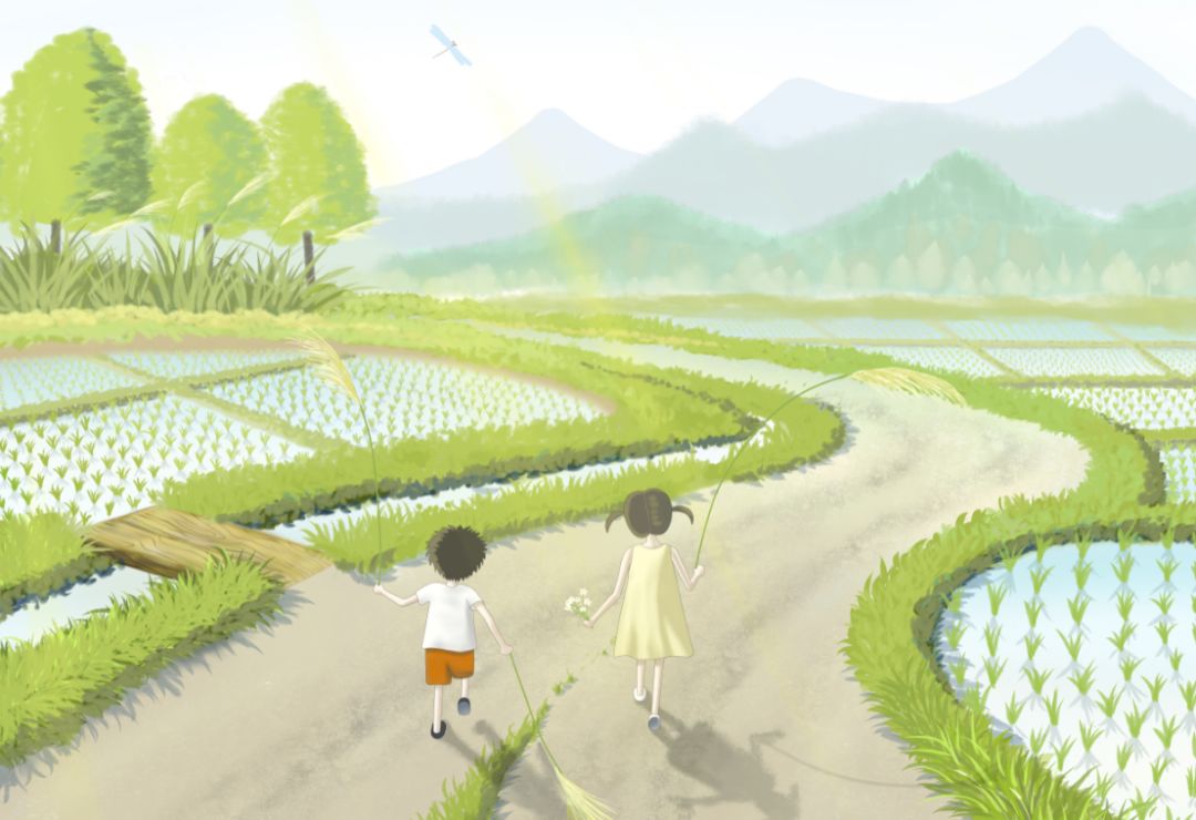 篱笆稀稀落落,一条小路通向远方,树上的花瓣纷纷飘落,却还尚未形成树阴。小孩子飞快地奔跑着追赶黄色的蝴蝶,可是蝴蝶突然飞入菜花丛中,再也找不到了。