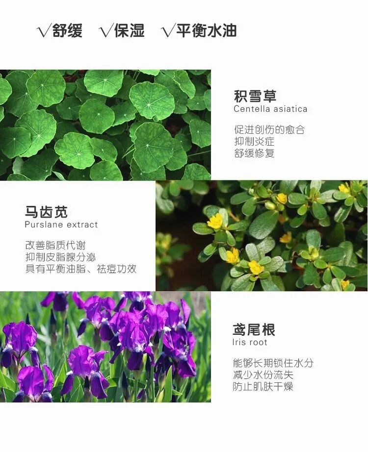 含有积雪草、马齿苋、鸢尾根等