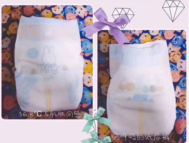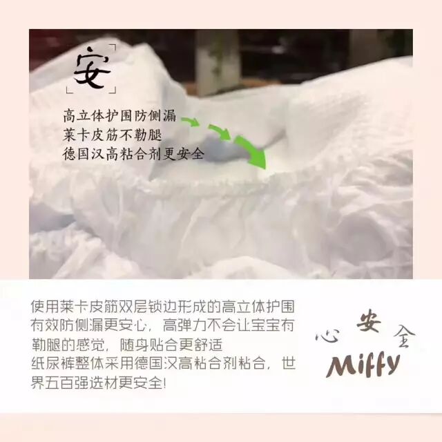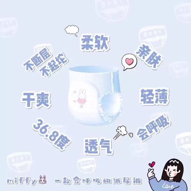 采用了市面上最好的热风无纺布底膜,3D压花工艺,大大增加了米菲纸尿裤的透气性,采用全芯体的高分子吸水树脂,不断层不起坨,特别柔软,薄如硬币,保证了宝宝舒适的同时还超能吸。