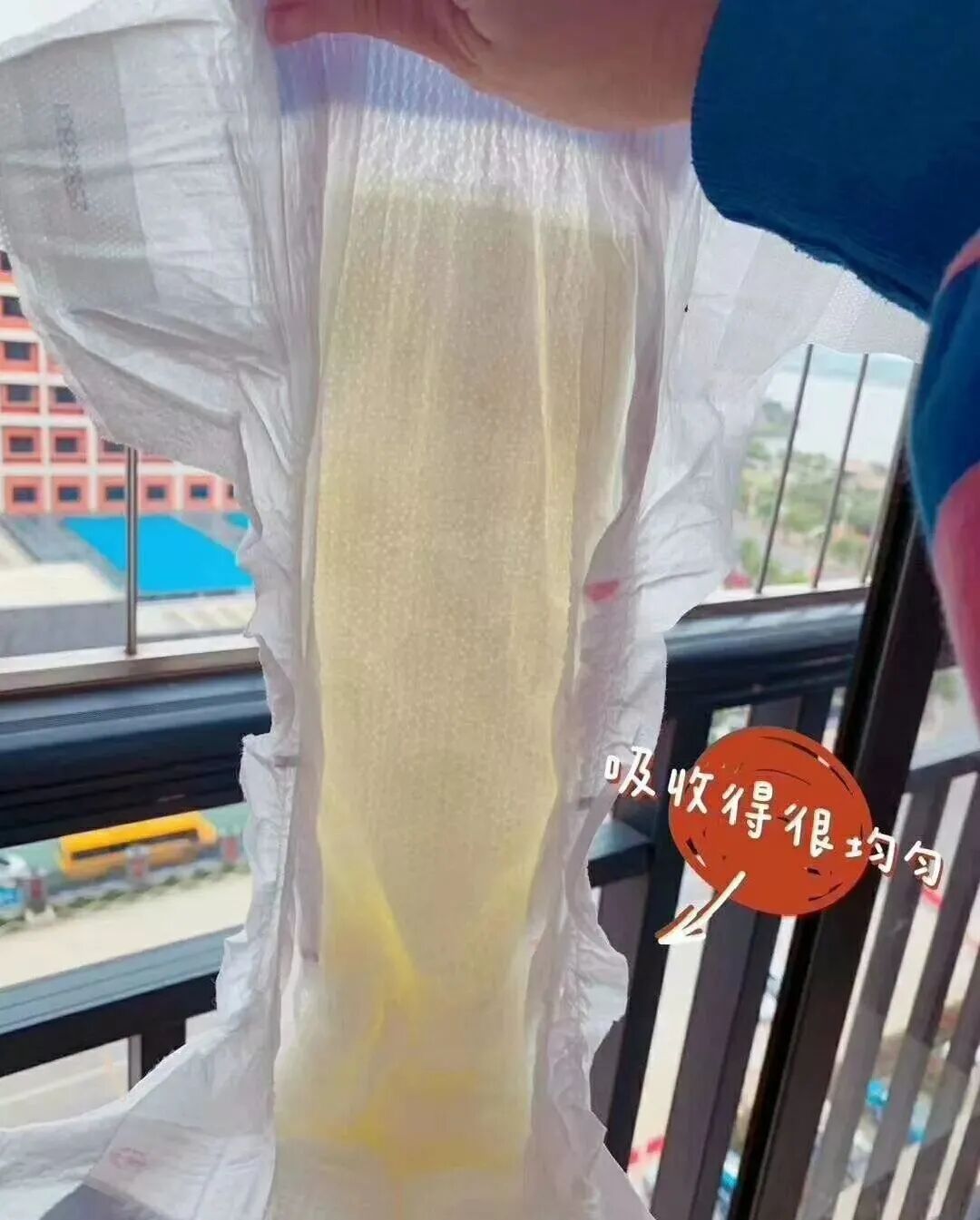 吸收满水分的纸尿裤应该仍然平整,没有内侧起坨成块的变化。