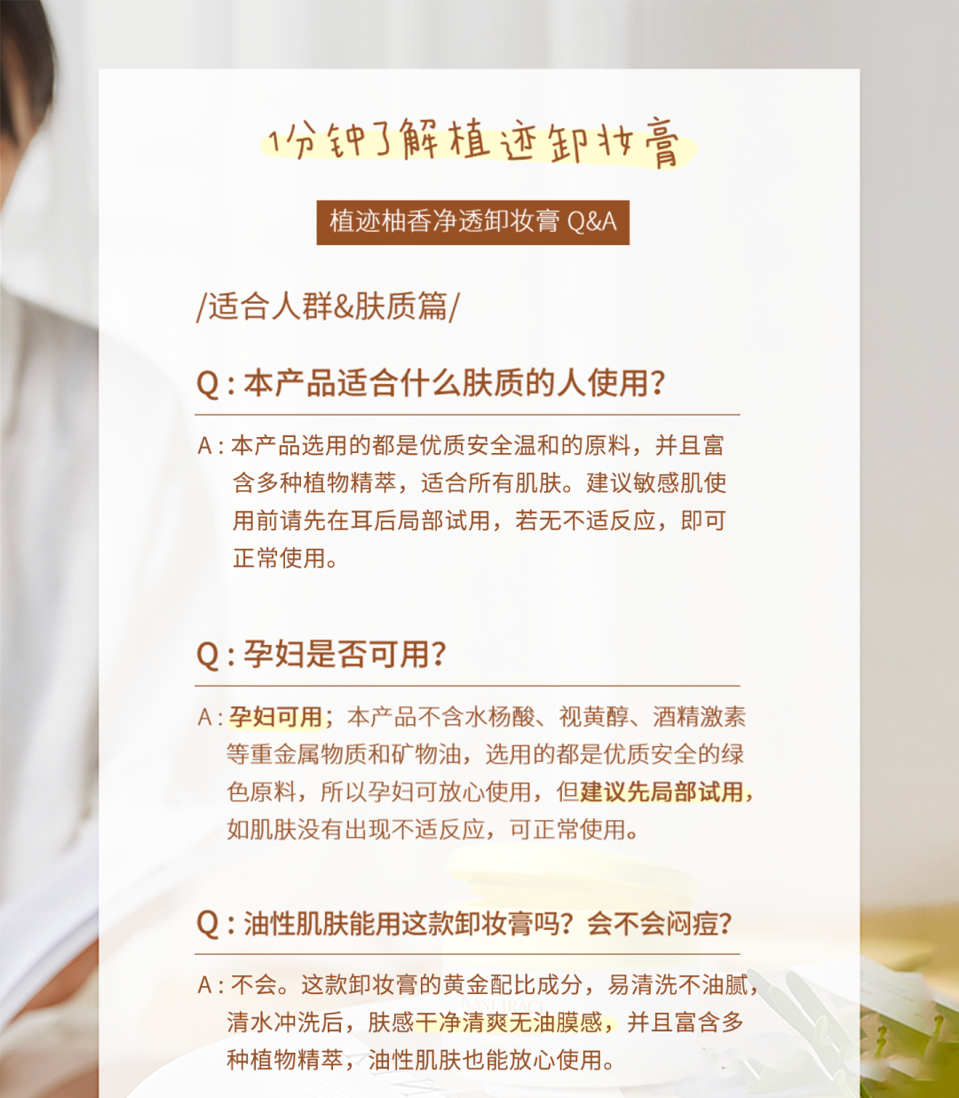 植迹柚香净透卸妆膏采用“创新无水卸妆技术”,黄金配比的多种油成分,能与彩妆污垢完全融合,延展渗透进入每一个死角,并且依靠其强大的包裹性迅速裹覆彩妆污垢,达到完全的卸妆效果。清洗中的乳化只需将污垢冲走即可,并不承担溶解彩妆的作用。