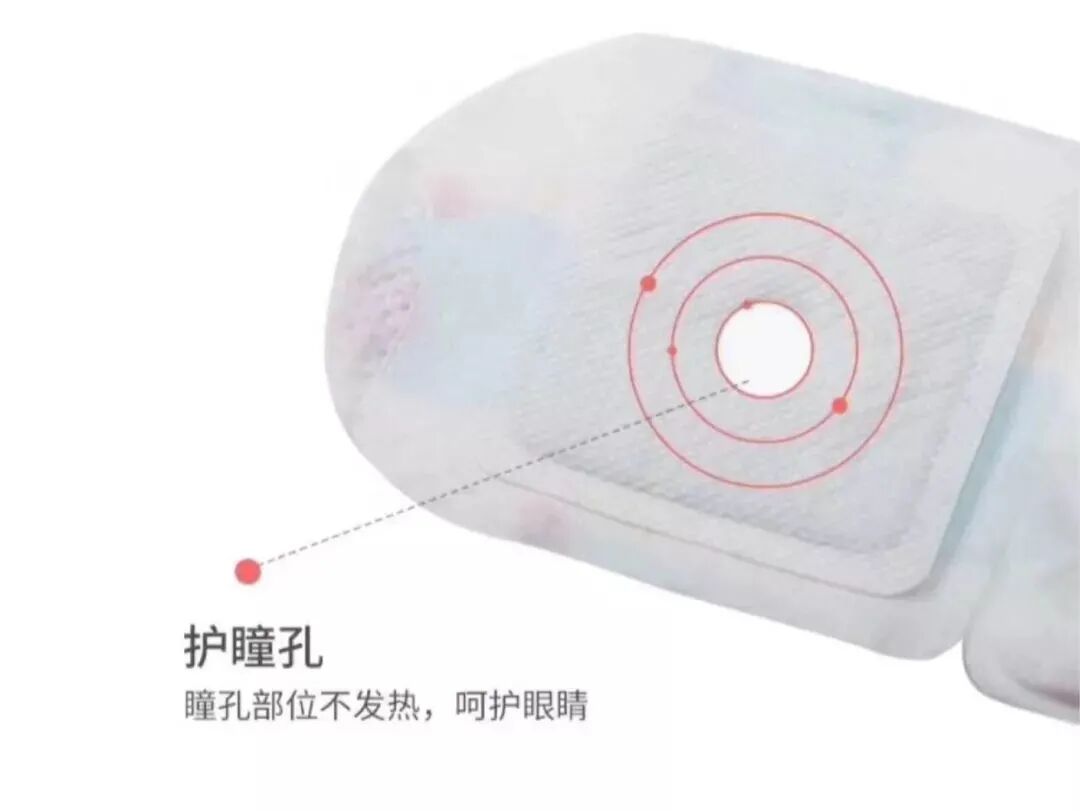 眼部中心部位采用12mm圆形无热区专利设计,使得眼球部位温度低于眼周,避免眼球过热,同时防止发热体坠袋,眼部受热始终均匀。