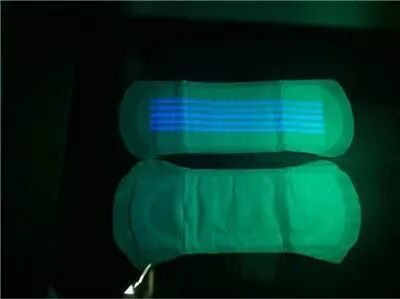 最让人忽略的有荧光剂的部分就是胶水,一片卫生巾从原材料到成品需要好几十道工艺环节,生产中需要一层层的粘合,还有姑娘们黏在内裤上的胶,忽略了就容易踩坑。大部分商家选用的普通胶水,可以在长波紫光灯下反射蓝光,就是含荧光剂。