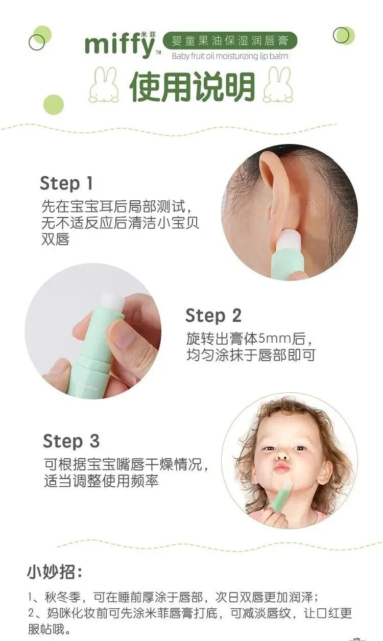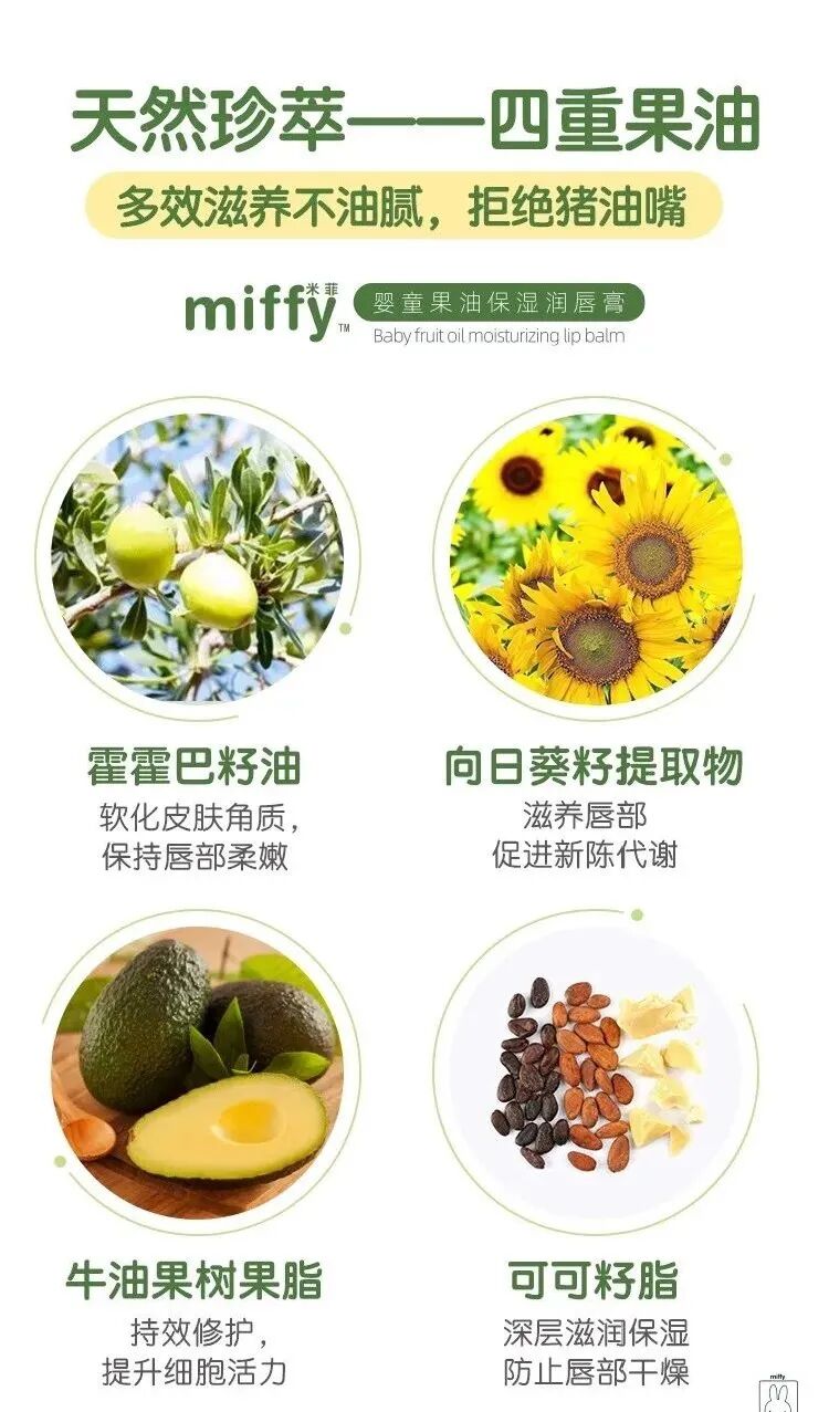 宝宝的润唇膏,除了保湿效果外,成分安全当然最重要,米菲婴童果油保湿润唇膏,天然原料,可食用的润唇膏。米菲,以妈妈之心,做宝宝之物。