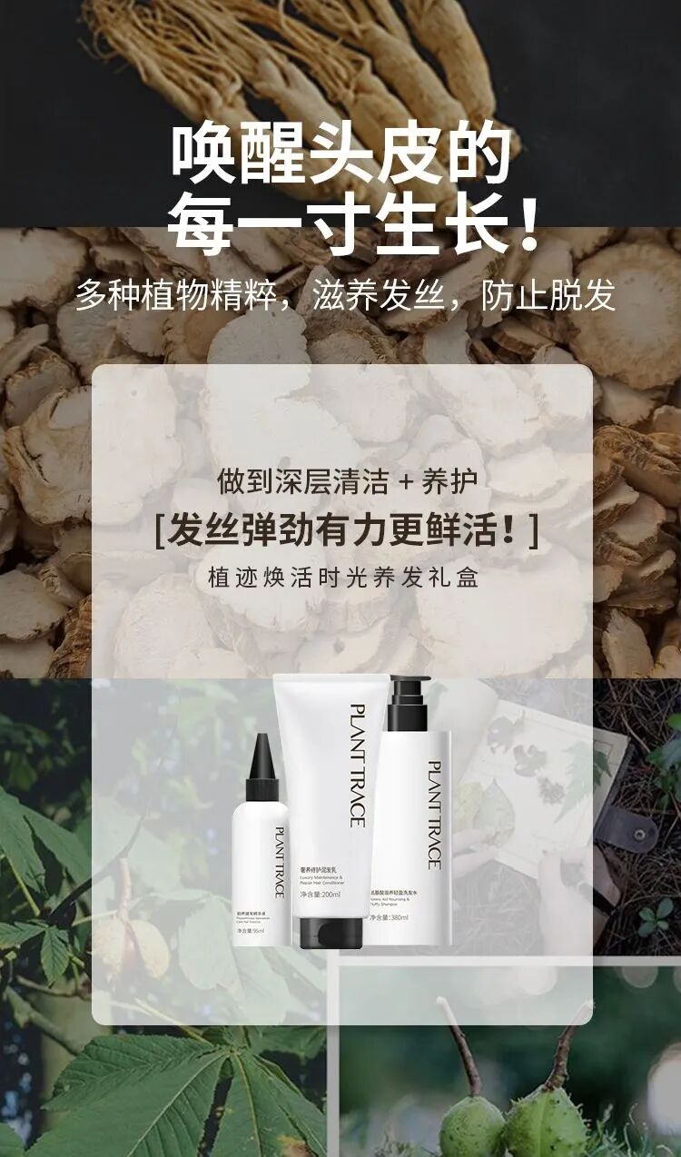 针对以上种种秀发问题,米菲研发出拯救秀发的植迹洗护三件套:植迹焕活时光养发礼盒