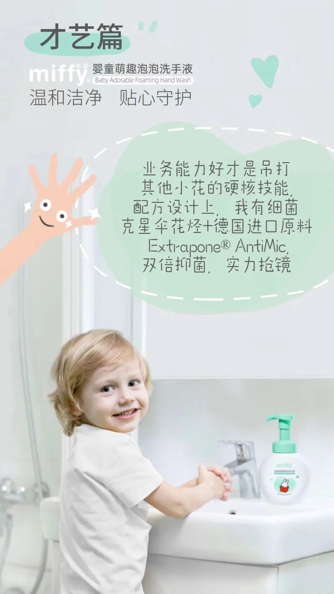 选用德国进口Extrapone®️Antimic,凝聚7种植萃鲜活能量,融入天然氨基酸洁净更呵护,云朵般绵密泡泡为宝宝洗手增添乐趣。