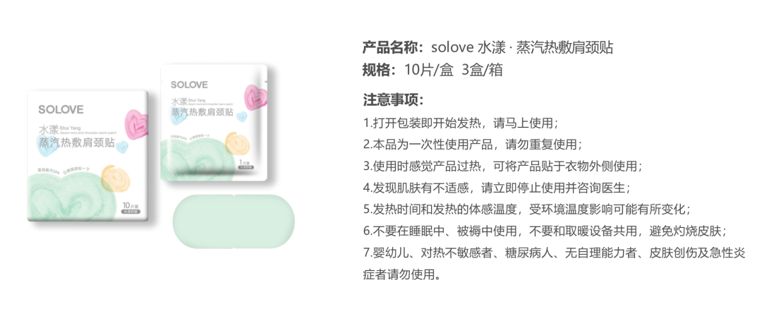 SOLOVE 水漾·蒸汽热敷肩颈贴采用热敷疗法的原理,温润蒸汽SPA,让肩颈放松一下 。