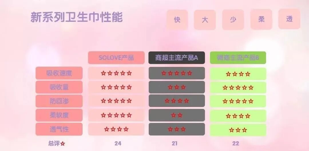 总结:怎样的卫生巾能称为优质的卫生巾呢?第一,安全健康。其次,吸收快,吸量大,柔软,透气。我们产品在这些指标上都是达到的,而且我们产品在柔软和透气上做的非常好,所以说,可以秒杀市面上的大多数卫生巾产品。