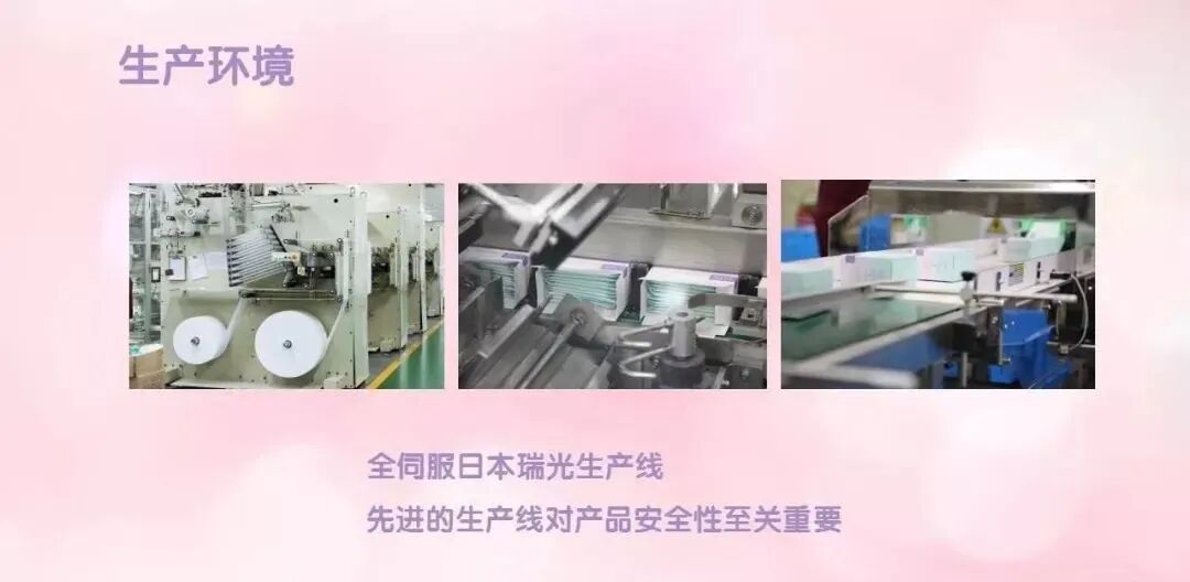 产品的安全性:从生产环境来说,此次生产的新品,是在千芝雅生产的,全伺服瑞光生产线。生产速度,>1000片/分钟。先进的生产线对产品的安全性是至关重要的,从选材上,美国3M,美国汉高,日本住友高分子。
