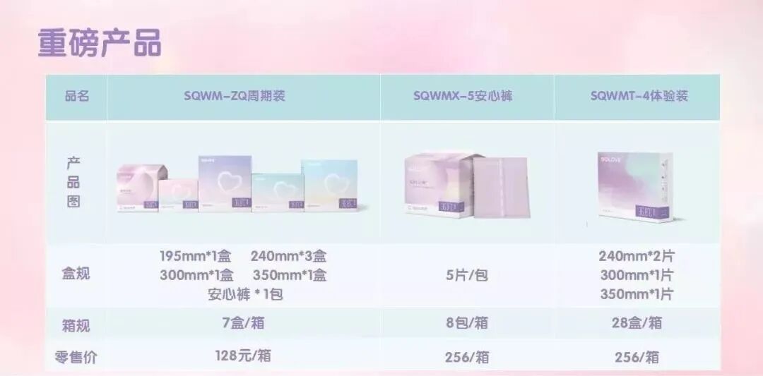 安心裤:从之前的4片调整到现在的5片,8包/箱,256元/箱。性价比更高。