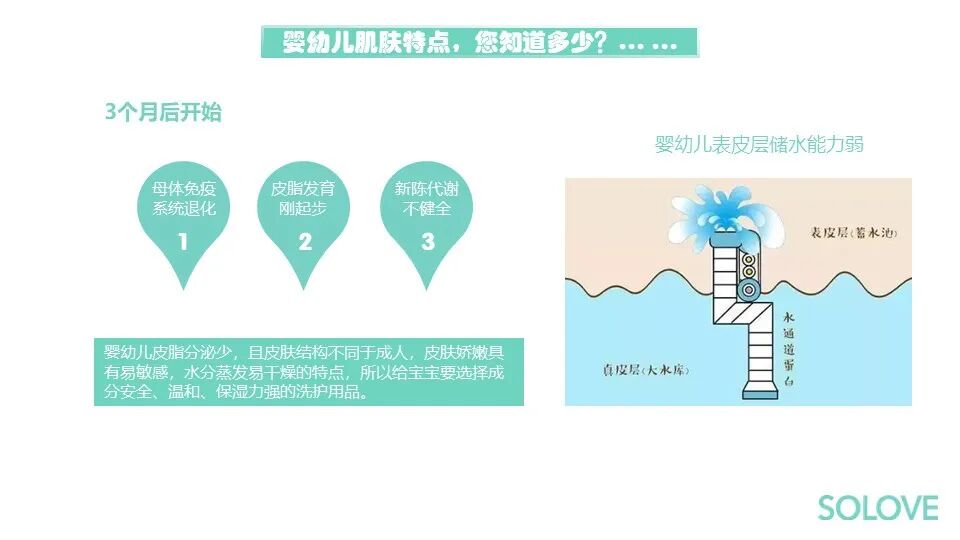 人体皮肤就像这张图,里面是真皮层,好比大水库储存了很多水,真皮层上面是表皮层,是储水池,它的储水能力决定了整个皮肤的状态。整个婴幼儿时期,处于一个表皮储水能力比较弱的状态。
