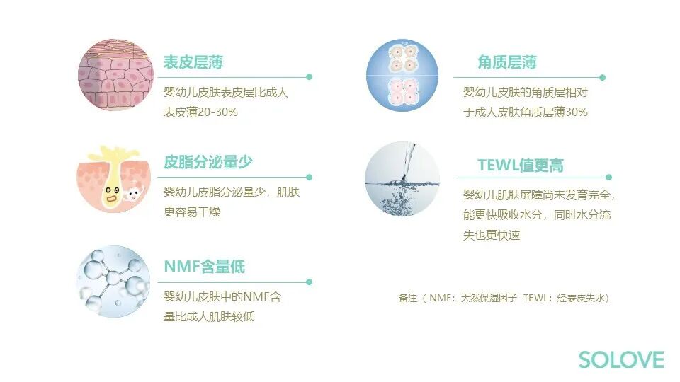 因为这三点原因,所以导致婴幼儿皮肤里的NMF含量低,TEWL值更高,也就是它的水分流失会更快。