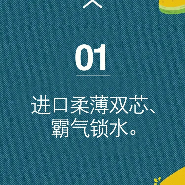| 进口柔薄双芯,霸气锁水。 | 无感瞬吸快导,极致干爽。 | 纳米微孔渗透,高效排湿。 |