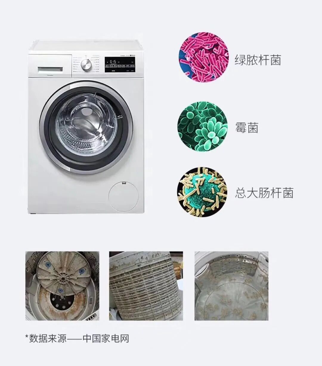 长期清洁不净的洗衣机槽,会积累大量细菌,污垢!