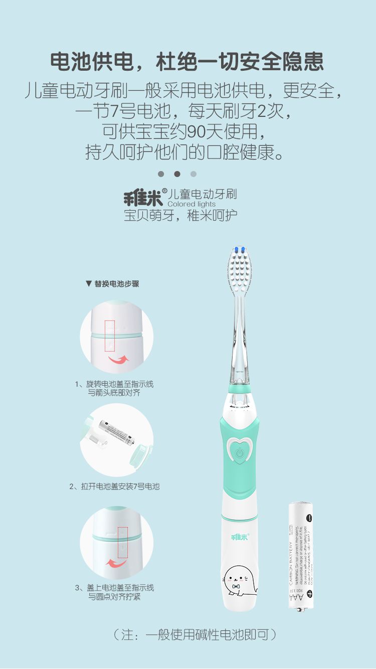 采用电池供电,只需一节7号电池持久呵护宝宝口腔健康,每天两次刷牙,1节电池可供孩子90天使用。