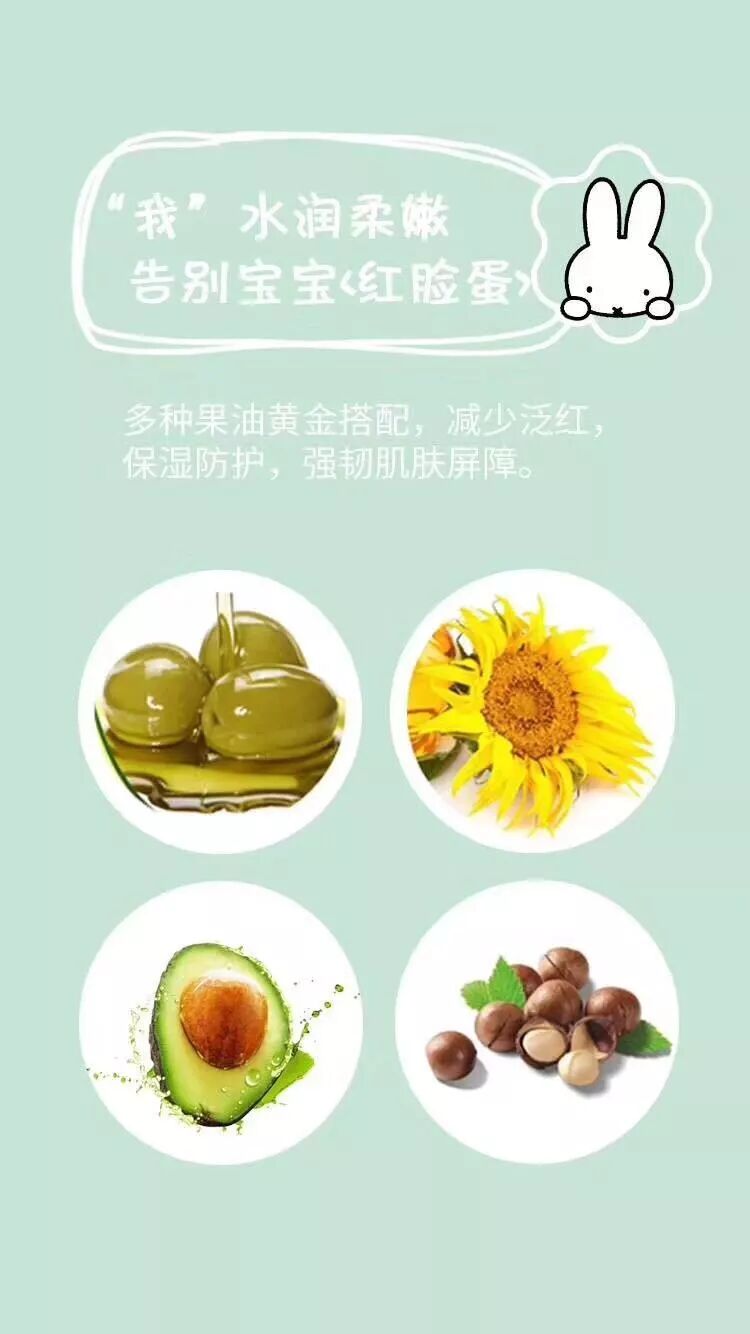 1. 天然油橄榄果油、鳄梨油、澳洲坚果籽油、向日葵油4种果油通过黄金配比有效滋润肌肤,对冬季宝宝皮肤的粗糙干燥有效,天然温和。