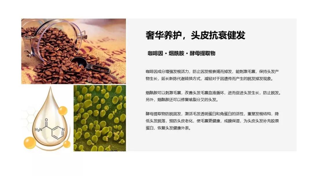 咖啡因、烟酰胺和酵母提取物的添加,增强发根活力,让头发更快生长。同时抑制头皮氧化,减轻头发衰老程度,保持头皮年轻状态,为培育新发“打好地基”。