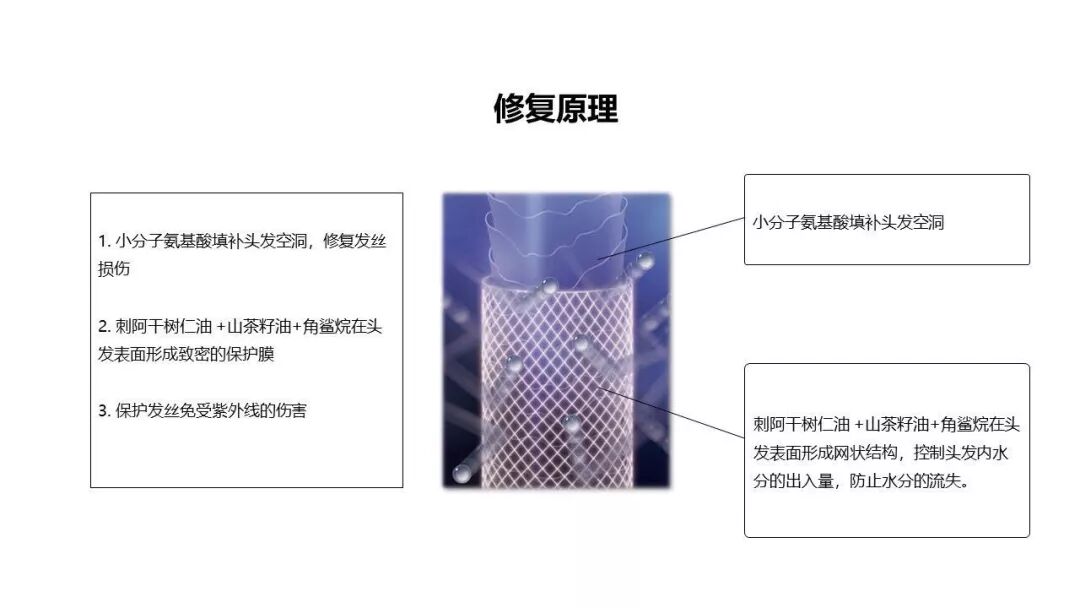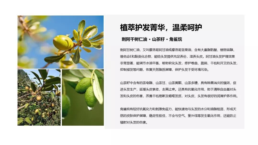 刺阿甘树仁油和角鲨烷,富含丰富的不饱和脂肪酸,容易被头发吸收,给头发充分营养,修复受损的头发和毛囊。