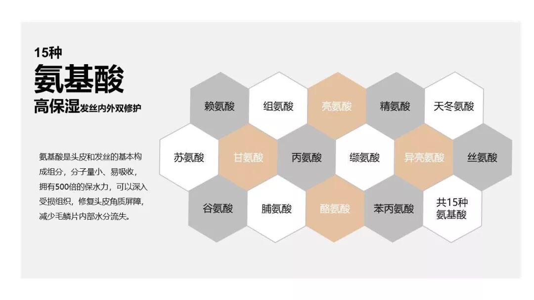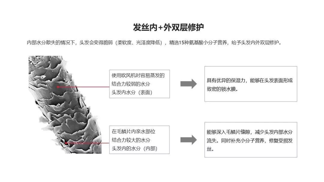 含有多种小分子氨基酸营养成分,深入修护头发受损部位,层层滋养秀发并增强发丝支撑力,让头发光泽柔顺且易于梳理。