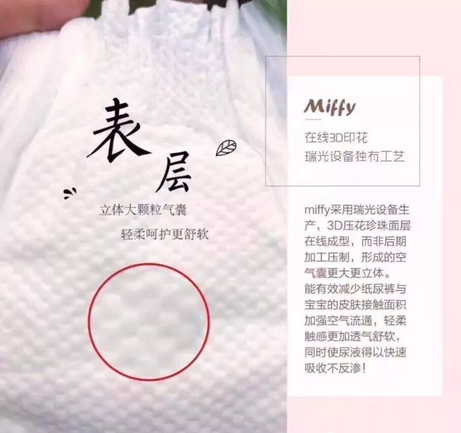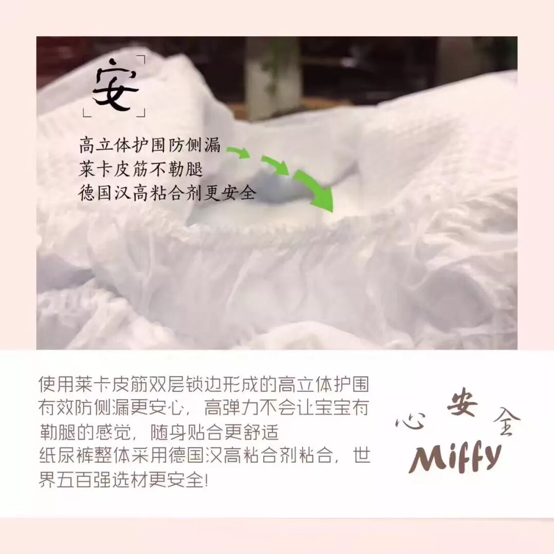 质量上乘,设计用心。米菲从热风无纺布底膜、到立体大环腰、3D珍珠面层、3M腰贴、再到全芯体结构和双层防侧漏设计......