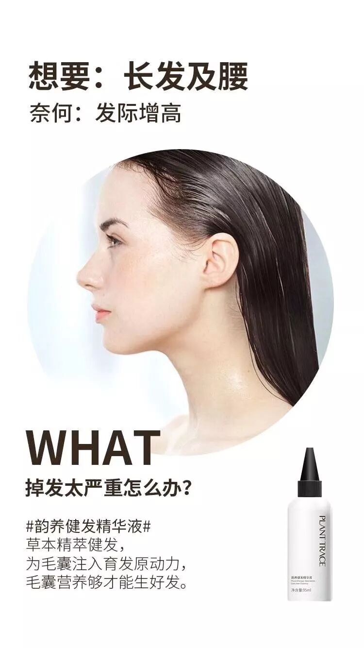 总结精华液:平衡油脂分泌,改善头皮环境,减缓掉发,稳固发根,改善头皮营养供给,对抗头皮衰老,帮助恢复活力,唤醒毛囊细胞,重现头发生命力,为茁壮新发输出生长信号。