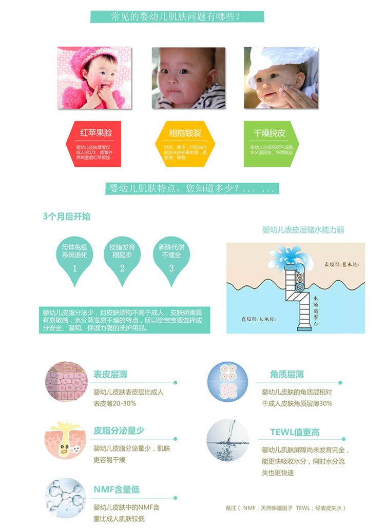 宝宝的皮肤极为娇嫩,而且发育程度低,所以宝宝的免疫系统弱。尤其是处在换季时节,也是宝宝过敏、哮喘、湿疹高发的时候。要想保护好宝宝的娇嫩肌,最好细心呵护宝宝皮肤上的那层保护膜,减少外来刺激。所以,给宝宝清洗皮肤时,应选择温和、安全又有效的洗护用品,这样才能在保证有效清洁的同时不会对宝宝的皮肤产生刺激。