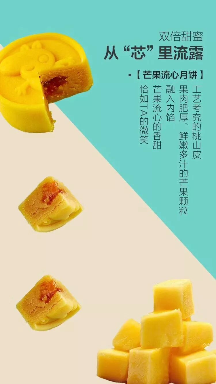 工艺考究的桃山皮,果肉肥厚、鲜嫩多汁的芒果颗粒融入内馅,芒果流心的香甜,恰如TA的微笑