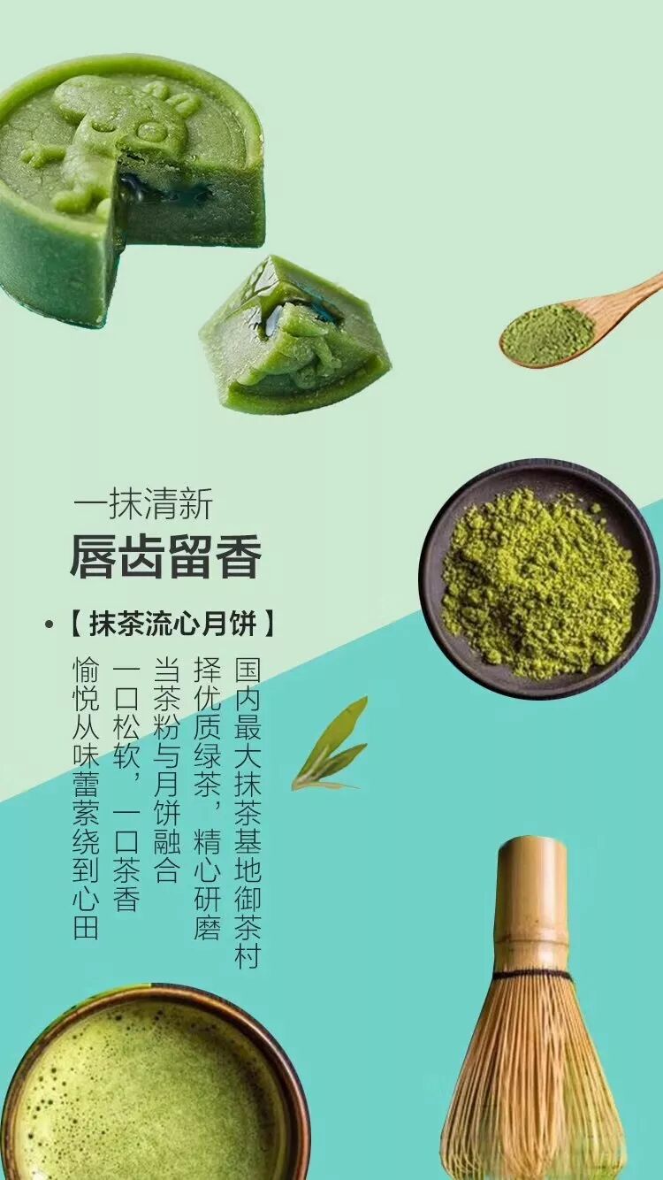 国内最大抹茶基地御茶村,择优质绿茶,精心研磨。当茶粉与月饼融合,一口松软,一口茶香,愉悦从味蕾萦绕到心田