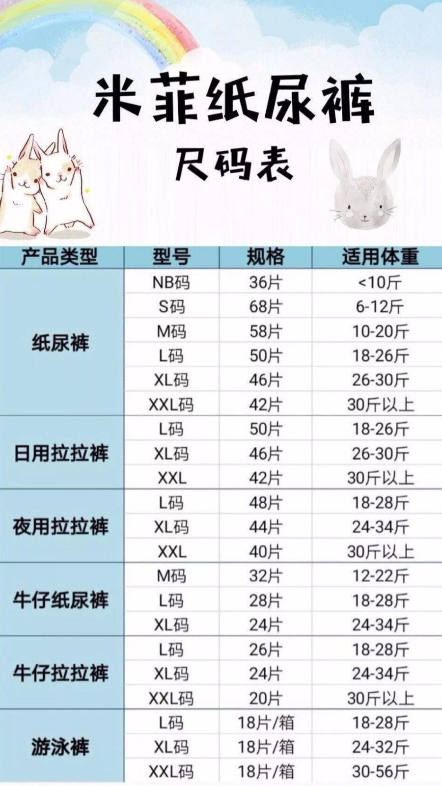 米菲纸尿裤,拉拉裤,牛仔裤,游泳裤尺码表✅
