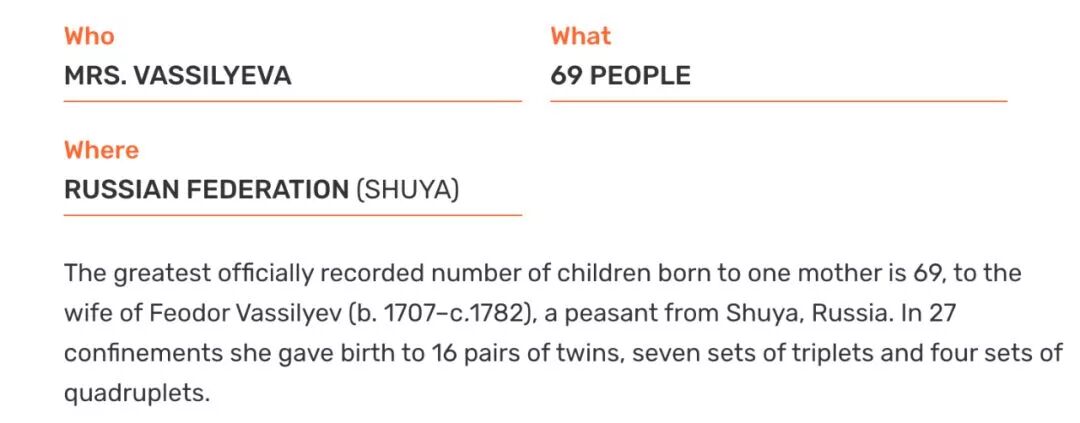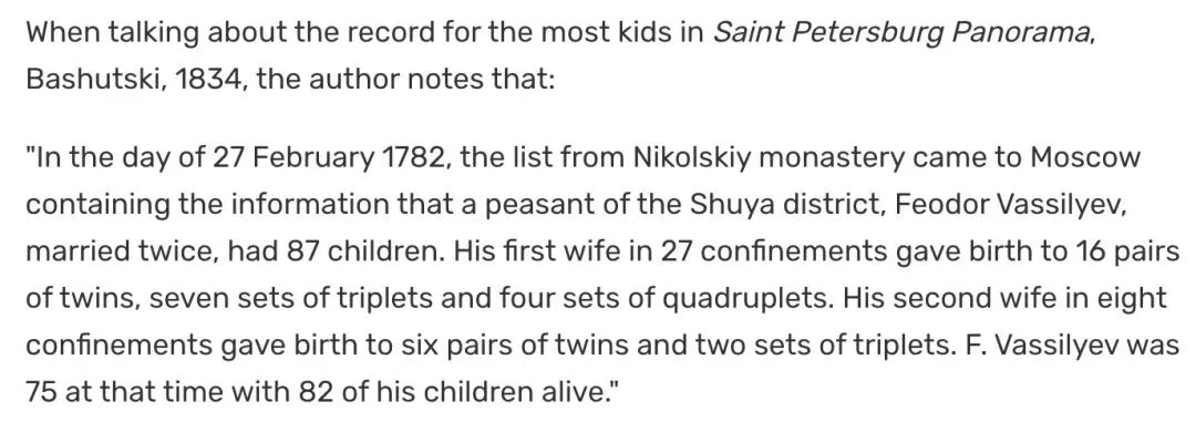 不过,事情却没有那么简单。这位俄罗斯妈妈老公的第二任妻子,在这之后又生了18胎。其中6个双胞胎,2个三胞胎。