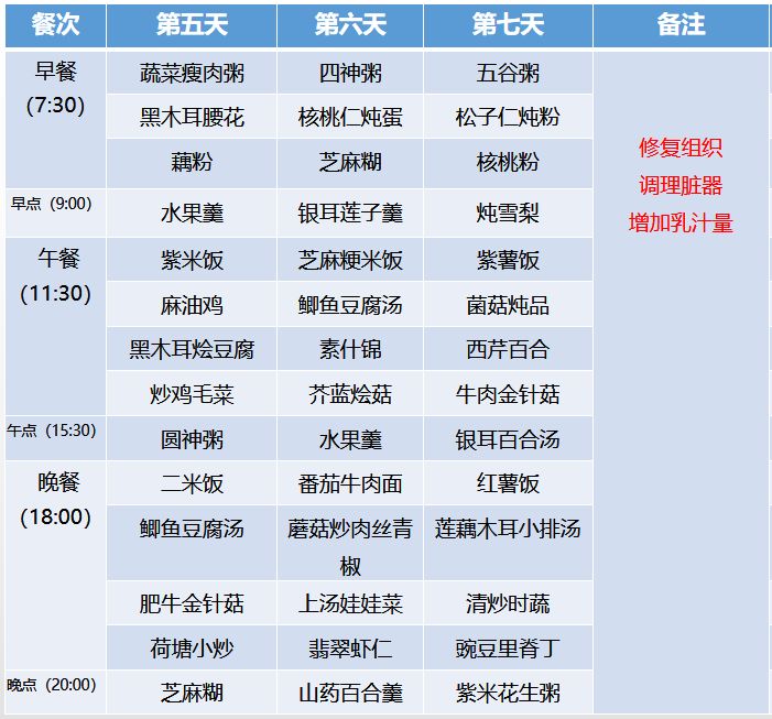 通过膳食调整增加产妇乳汁的数量和质量,增强产妇的脏器体能恢复,促进身体相关体能的恢复;