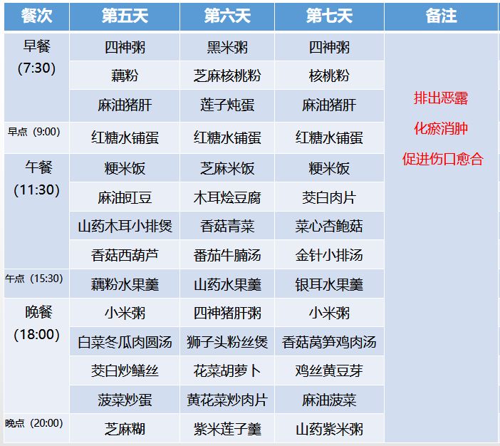第一阶段:(产后1-7天)排净恶露、化淤消肿、愈合伤口