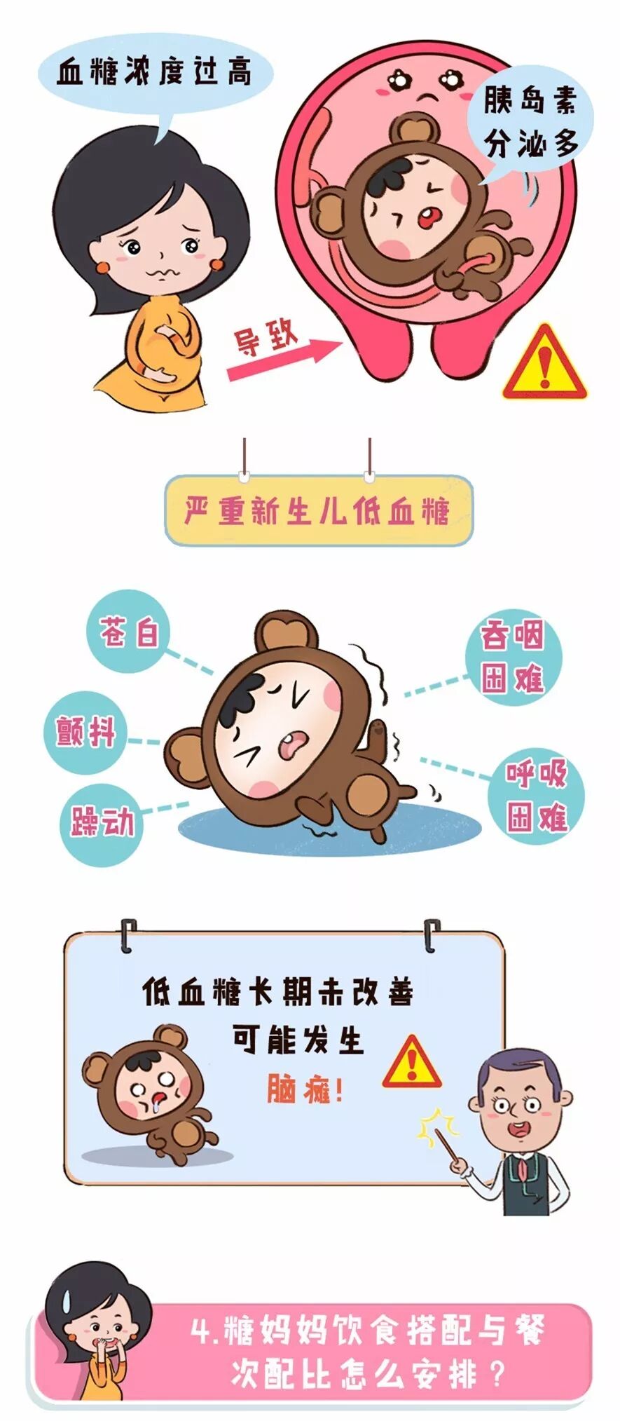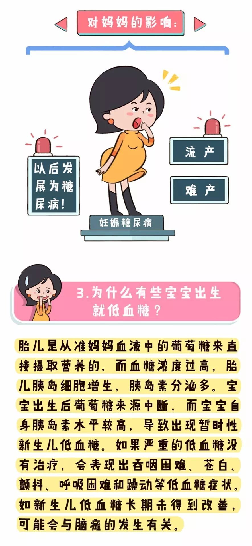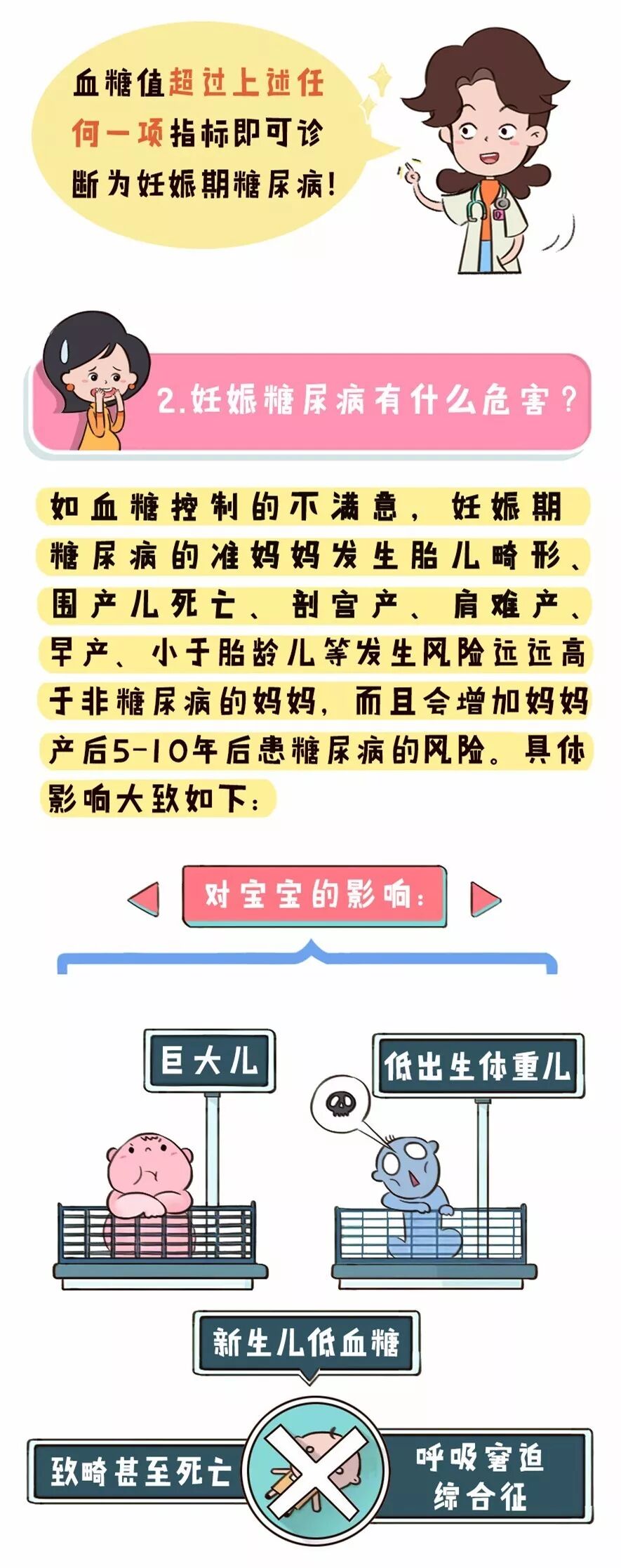 对宝宝的影响:巨大儿;低出生体重儿;新生儿低血糖;致畸甚至死亡;呼吸窘迫综合征等。
