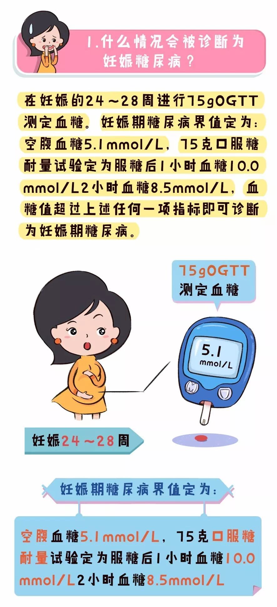 空腹血糖5.1mmol/L,75克口服糖耐量试验定为服糖后1小时血糖10.0mmol/L,2小时血糖8.5mmol/L,血糖值超过上述任何一项指标即可诊断为妊娠期糖尿病。