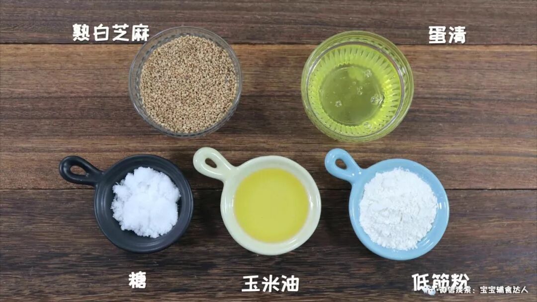 食材准备:蛋清80克、熟白芝麻50克、低筋粉35克、玉米油25克、糖20克