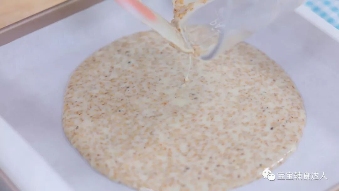 将芝麻糊倒入提前铺好硅油纸的烤盘中,铺平。