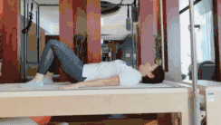 2. 桥式运动:吸气准备,呼气时从尾骨开始向上逐节卷动,再次吸气准备,呼气时从胸口逐渐下落。