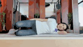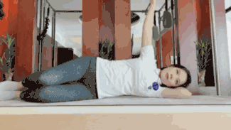 4. 蚌式开合:侧卧于床面,膝盖自然弯曲,吸气准备,吐气时向上提拉腰线,尝试让腰线一直提离床面,同时打开右侧膝盖。