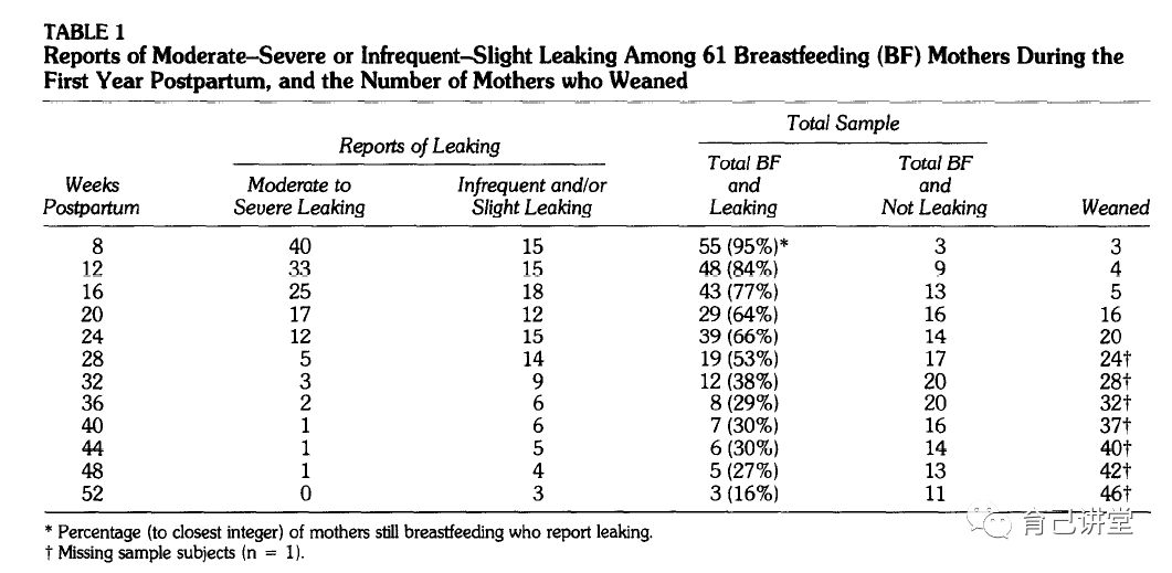 Janice M等从婴儿出生后的头两个月内,每月对61名打算重返工作岗位的哺乳期母亲进行电话访谈。总结出下面这个图表,可以看出产后8周哺乳还在漏奶的占95%,12周时占84%,到28周时降到53%,48周时占到27%。对于这些女性,泄漏的持续时间为3-41周。其中也有人说整个哺乳期间都在漏奶。