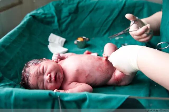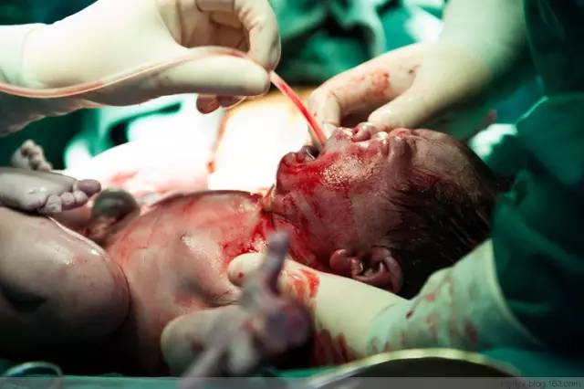 刚刚和母体分离,护士赶紧把孩子嘴里的羊水吸干净