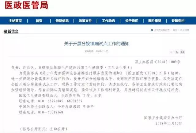 2018年11月20日,国家卫生健康委员会发文,提出2018至2020年在全国开展分娩镇痛试点,并逐步在全国推广分娩镇痛的诊疗。