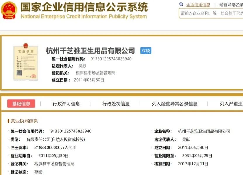 2011年5月30日杭州千芝雅卫生用品有限公司成立,注册资金2.18亿元,专注于尿裤、尿垫、隔尿垫等母婴、家纺产品的销售。