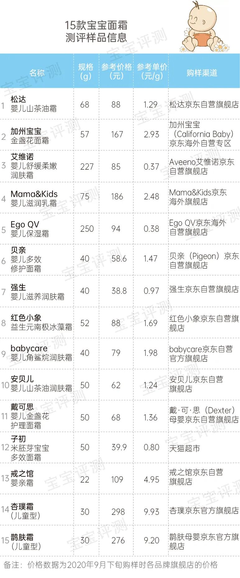 经过【上篇】对“注意成分”的筛选,以下15款宝宝面霜成为【下篇】的评测对象。